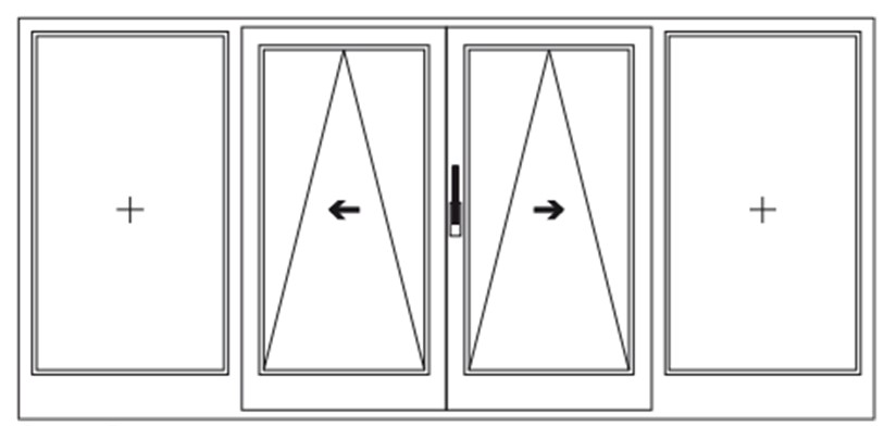 C - оконный проем разделен на 4 части, сдвигающиеся элементы располагаются в центре проема и сдвигаются влево и вправо