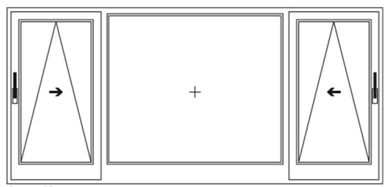 K - оконный проем разделен на 3 части, центральный элемент является глухим, подвижные створки перемещаются в центр.